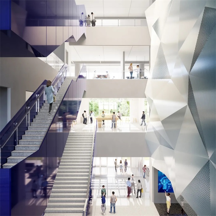 综合体育馆包含篮球馆,游泳馆、健身房、室内跑道、室内攀岩等运动设施。室内跑道和室内攀岩区不仅可以为喜爱跑步运动的师生们提供不受天气限制的锻炼场所,还创造了与他人视觉上的联系,让单调的锻炼变得生动起来。体育馆内的大阶梯不仅可以连接楼层,也为师生们创造了在运动前后交流和放松的机会。