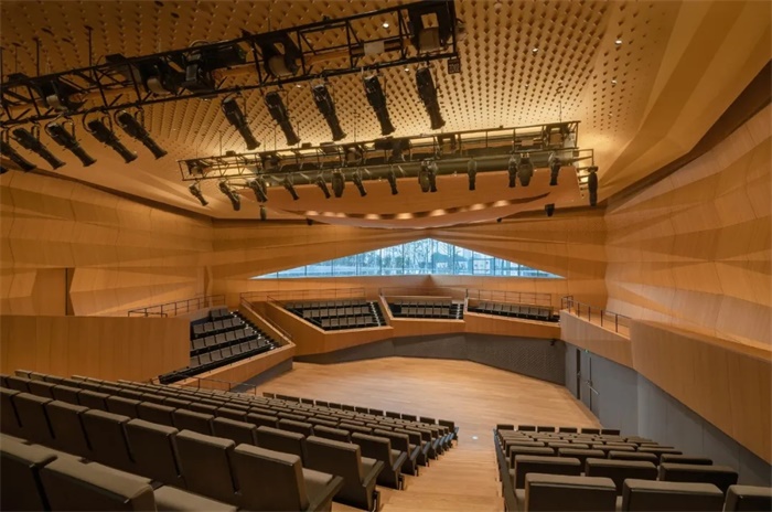 建筑由四个多面体块组成,包括一间容纳690人的音乐厅、一个295人的演奏厅、一个225座的黑匣子剧院以及相应的行政办公和排练空间。五座玻璃悬桥将这些空间串联在了一起,使得周边的公园环境融入大楼内部,给学生、市民和职业音乐家们提供了一个相互切磋的彩排和表演空间。玻璃桥内设有教室、工作室和排练厅,以开放通透的空间设计,促使了各个群体间的交流沟通。