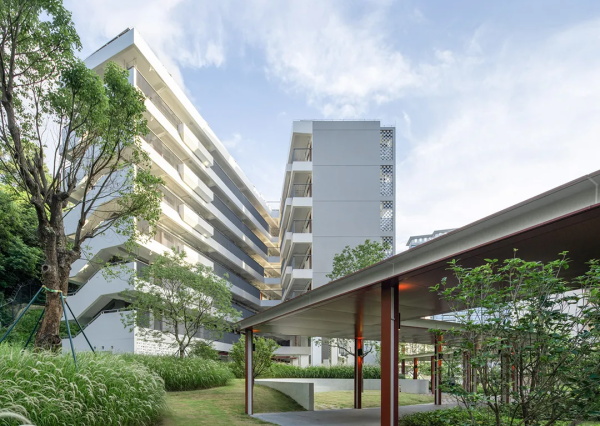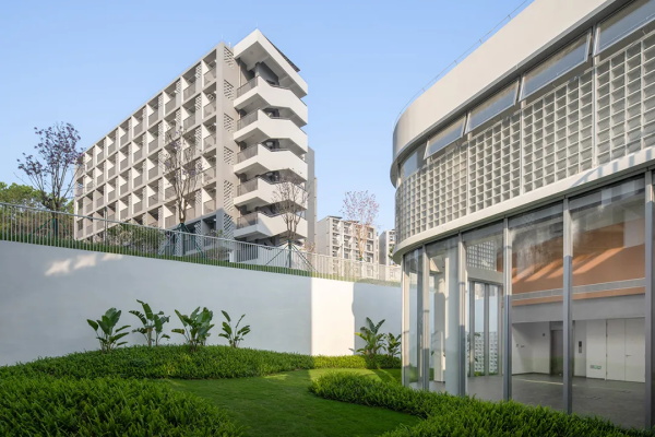 教学与生活组团首二层架空,如同人造山体般层层叠叠,自然通风与采光通过错动缝隙贯穿其中。教学区结合高差布置C形半开放庭院,生活区与山体形成透风透景关系,艺体区则以分段退让、通透构件与周边住宅区形成友好界面。地下设置家长接送区缓解交通压力,艺体区艺术教室与体育场馆可定期向社区开放,实现校社共享。
