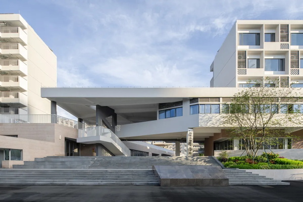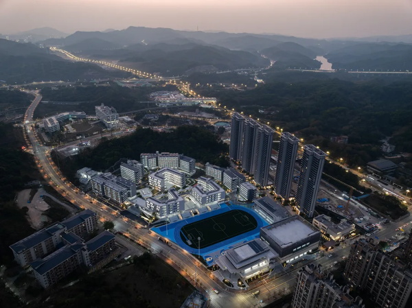 广州天健中学位于黄埔区长贤路,地处东部山水新城核心区域,北临帽峰山生态廊道,南接科学城先行区。校园选址在一片复杂山地,西高东低、南高北低,最大高差达20米。设计充分尊重场地条件,将教学、生活、艺体三大组团对应不同标高的三个平台布局,从西到东实现从自然环境向城市空间的过渡。建筑向内采用连续廊道与横向线条,向外则以单元组合立面呼应街道,形成疏密有致的空间节奏。