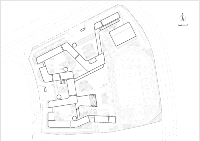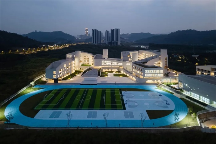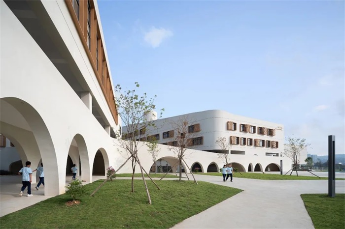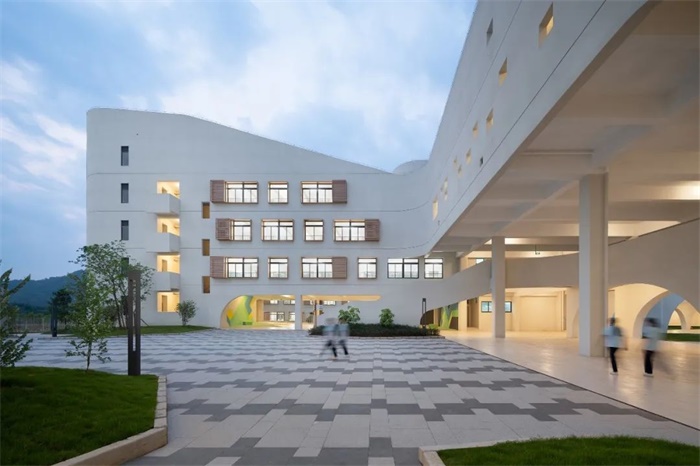 我们设计了一条蜿蜒跌宕的线性建筑,与山峦、小河对话,并把校园分隔为一个个半开放的庭院,取意“九曲园”。建筑群面向东侧运动场呈开敞的姿态,让校园内部空间联通渗透;而在北侧和西侧主要道路面,建筑贴线塑造了街廓边界,并自然形成两个内凹的院落,分别作为小学和中学主入口。中小学分为两个区域,日常上下学互不干扰。