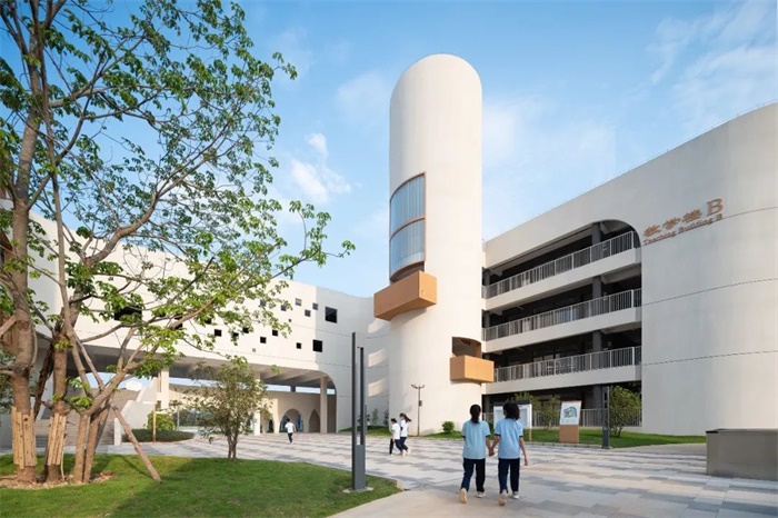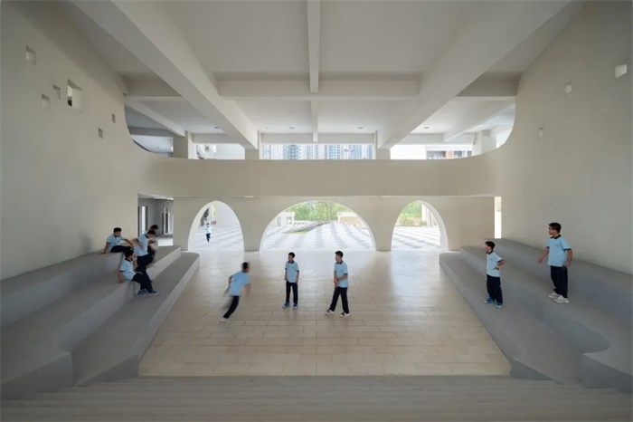 惠阳紧邻深圳,但这座学校的单方造价不到同期深圳中小学的三分之二。在设计之初,我们制定了几个应对低成本的设计策略。如低限度的使用异形或曲线;不用任何昂贵的结构和构造做法;在满足通风采光的前提下控制窗墙比,减少窗的面积;不做不必要的装饰元素,不依赖材料品质和精美细节,用纯空间形体叙事等等。
