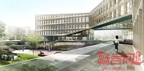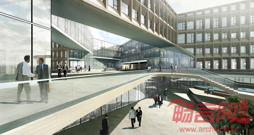 开敞空间交汇处的体量被抬高,令地面步行交通贯通,联结西面主入口,南、北面公园绿地和中心庭院。三个庭院被塑造出不同的性格:中心庭院作为人流汇聚点最为开放,也是公众活动集中的场所;南面的庭院联系中心庭院和东侧的公园,是半开放的景观庭院;北侧的庭院是由建筑围合的水院,为办公提供静谧的场所。三个功能体量作为三个主要的办公空间,既可以被独立地使用,也可以联结成为一体。他们由空中廊桥分别在二,三,四层联系起来,人们可以通过连廊在不同庭院之间游走。局部五层的办公楼结合屋顶花园,提供远眺城市风光的平台,也可以欣赏近处的景观和庭院。独特的建筑立面由模块化的遮阳屏板组成。屏板在水平向的渐变赋予了立面的流动性。这些不同斜度的屏板也改变了窗户的高度,控制室内空间的采光。