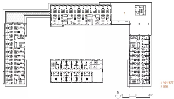在设计最初阶段,经济测算的介入,是保证项目得以落地的前提。在充足的商业配套和服务,以及三环边上的区位优势条件下,如何才能让运营方在可持续盈利的同时,将每户租金控制在工薪阶层可接受的范围之内?项目综合考虑了必要的各项成本和投资回报周期,以每套租金不超过,甚至低于周边市场的原则,确定了项目坪效,并推算出项目总套数不应低于900套的规模,扣除商业配套面积,得出平均每套建筑面积约25 ㎡。因此,在有限的套内面积限制下,集中的外置公共配套空间就显得更加必要,也形成了合理租金及充足配套的良性循环。