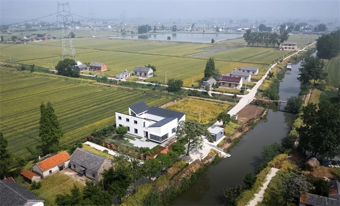 与传统合院建筑不同的是,住宅的坡屋面在每一侧做了局部的断开,成为风车形的四个独立屋面。下雨时,屋面的雨水汇集到内院,将传统的“水聚天心,四水归堂“的形制赋予了现代模样。居住空间通过院落的光影与景致联系在一起,充满场所感的日常生活氛围油然而生,勾勒出乡间生活的怡然自得与恬淡闲逸。