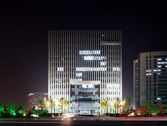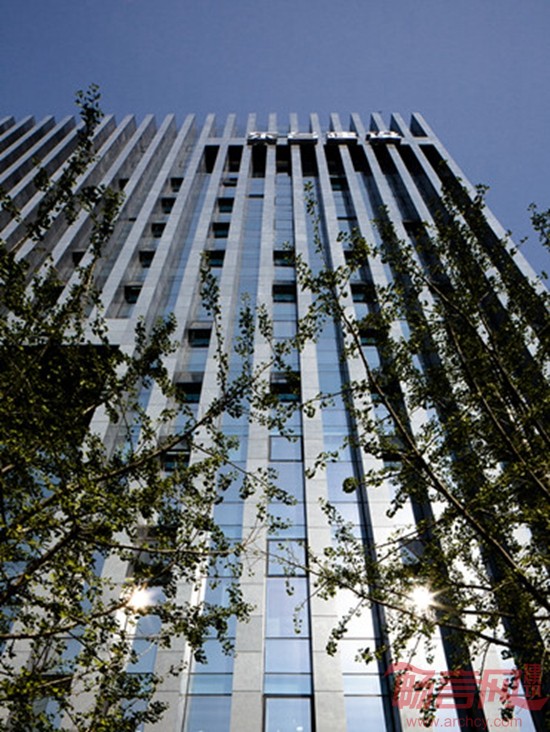 建筑形象依据构思自然生成,整体而独具特色。立面处理上,我们在竖向石材构件和玻璃幕墙之间寻求宜人的比例关系,其色彩对比强烈,在阳光下呈现明晰的光影效果。同时空中花园结合顶部构架的处理,外加玻璃的反射作用,营造了光影效果极为丰富而富有绿意的趣味空间。在本工程的设计过程中我们完成了各工种包括外幕墙、室内装修、景观设计、泛光照明的整体设计工作,使得整个建筑内外一气呵成,以简洁精练的语言体现了“新颖、独特、大气、稳重”“富有现代气息”的形象特点。