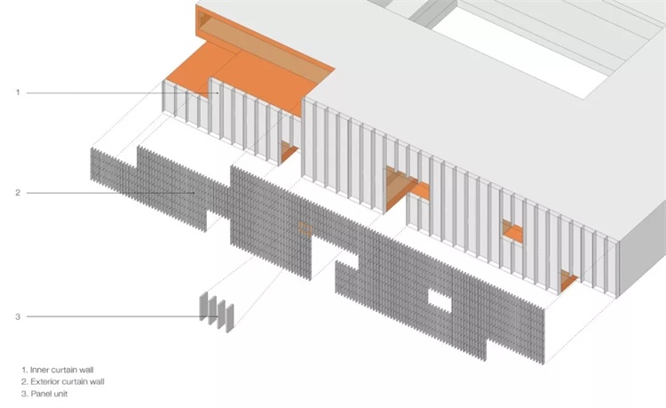 苏州高新区文体中心被当作城市空间和生活的一部分设计,17万平方米的巨大体量呈现为功能小模块的搭接,从而建筑的体量也得以消解,成为城市的一个有机组成部分。这种与功能紧密相扣的空间结构,正是“云形水石”概念的真正意义。在数字化的背景之下,建筑师们希望通过用一些简单抽象的方形体块,以一种魔方式、像素化的方式堆积在一起,来传达一种类似太湖石般精妙复杂的空间状态。凹凸的体块使空间产生一种“留白”,形式与功能的对应不再单一不变,多意和辩证的空洞结构的自主性可以通过复制和变异来适应环境,引导建筑自发生长而不破坏它的完整性。