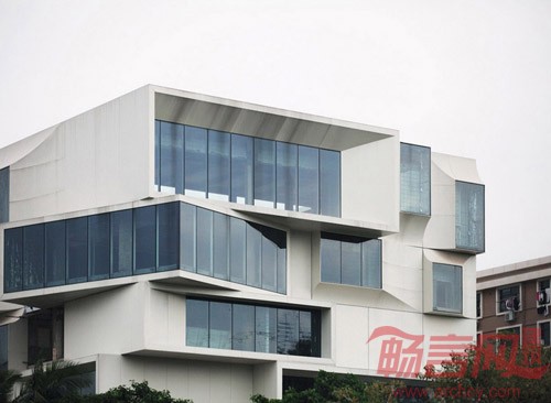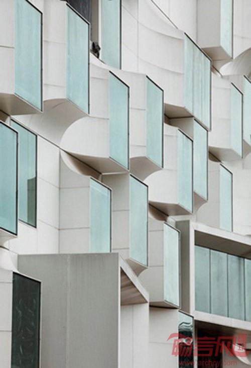基地四面的景观资源差异甚大:北面临接城市主干道,为最重要的迎街面,原有立面的窗墙体系已不能适应高端客房视线要求,其改造策略采用视野开阔、大小不一的凸窗。以标准客房单元为造型元素,窗户向外偏心凸起并做导角处理,与墙面平滑相接,形成四种基本模数,再通过重复、旋转、镜像,变异等手法排列出动态变化的三维立体效果。西面处在街道转角,面向优美的城市中心公园,视野开阔,在此面处理上将凸窗变异,扩大客房的开窗面积,将最高级套房设置在此,让客人能够享受到最好的自然景观。而南面为酒店的背面,面对陈旧的厂房宿舍,无景观可言,同时存在严重的对视问题,因此采取了侧向开窗的造型单元,在满足自然采光的同时,避免客人在客房里正视对面极为杂乱的景象。
