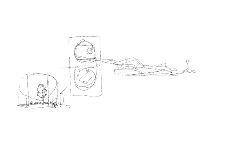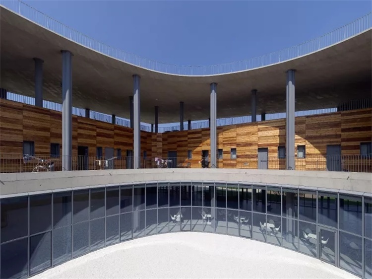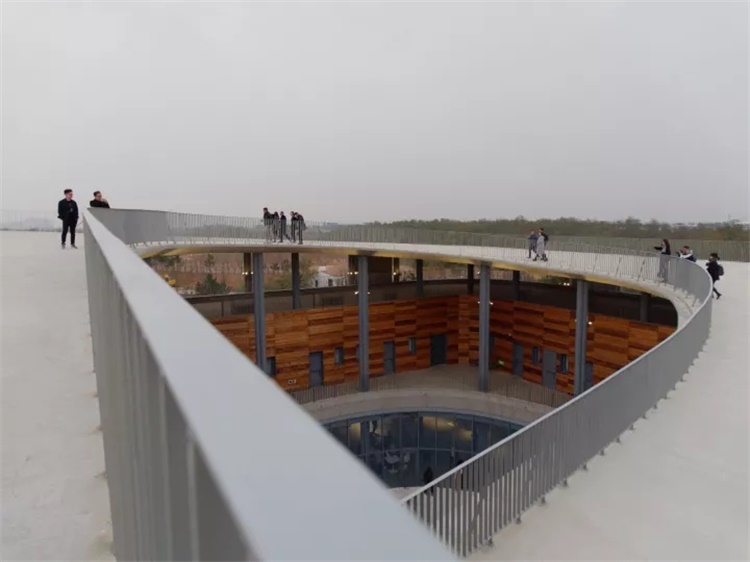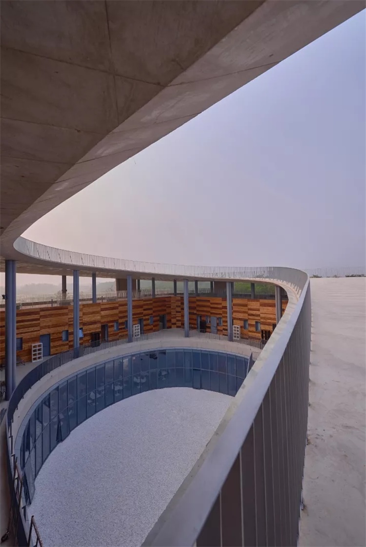 连续的坡道形成了一系列在其之上和于其之下的活动空间。在靠下的部分,坡道成了一个环绕庭院的临时观众席,并在其下形成了舒适的户外空间。用于支撑坡道并围合空间的混凝土墙上打开了若干巨大洞口,形成朝向沙丘景观和游戏场地的取景框。