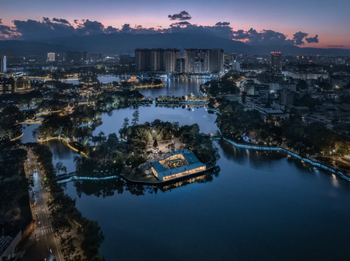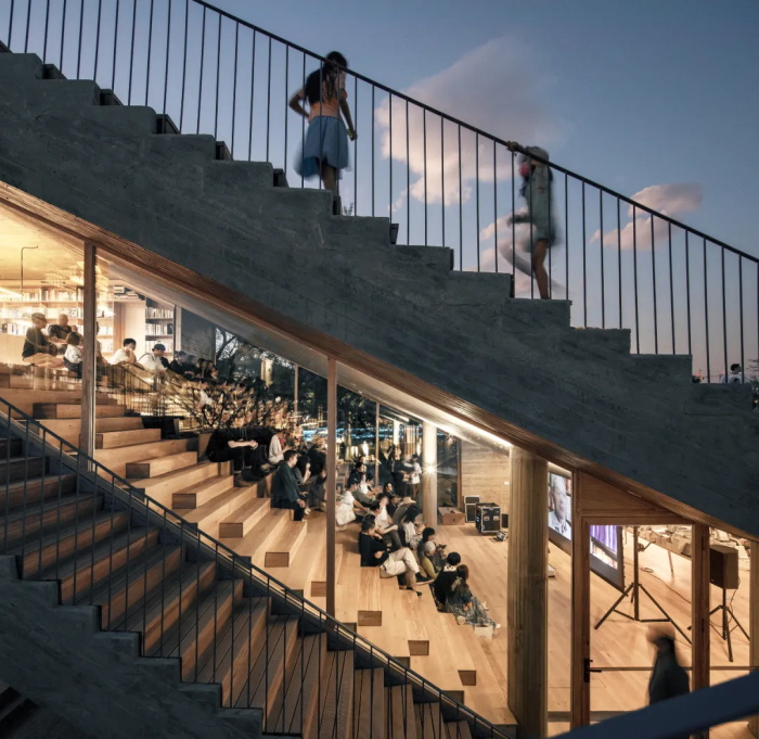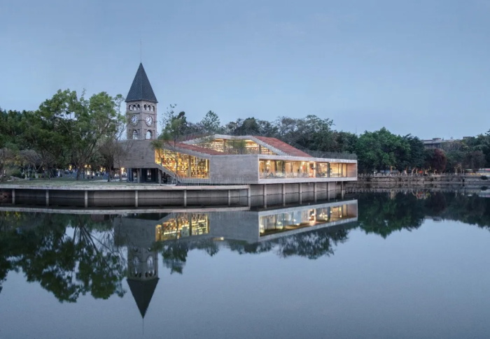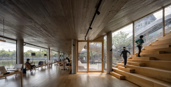 伴随着空间的攀爬,城市和湖山被依次收入于陡峭的报告厅、舒缓跌落的书墙,最后在探向湖面的休息区长幅展开。