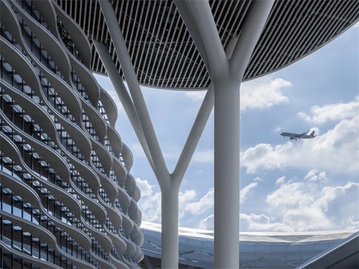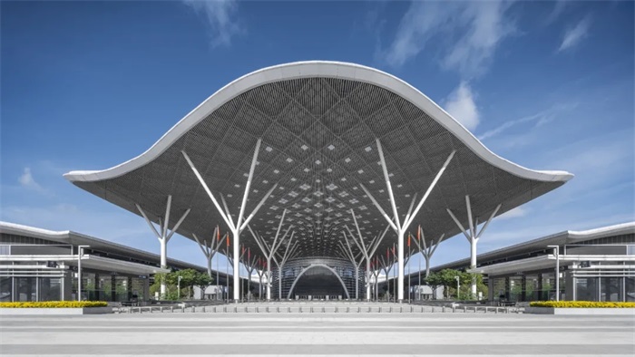 面对约160万平方米的超大体量,团队综合考量了城市特色、自然环境与人文符号,决定以简约、高效的现代主义理念和国际常用的“鱼骨式”布局结构,来演绎“海上丝路”的磅礴气势。