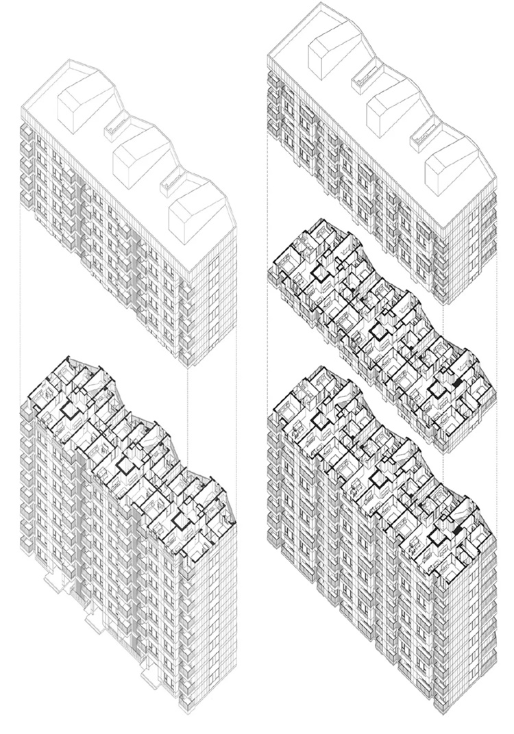 如果改一下《老子》的名言为“围宅以为庭院,当其无,有庭院之用”,则可以阐述围合式住宅对于居住的意义。虽然国人自古便崇尚苑囿之乐,但行列式是近几十年来中国住宅的一尊教条,并几乎成为唯一。这是基于居住个体本身以及房地产利益最大化的结果,是一种较为简单低级的算法。而都市的利益计算以及群体反向对个体利益的促进是一种复杂参数,将一些没有必要的以及服务于少数人的个体利益,让渡于其他的更重要的群体利益,就可以导出一些别的形态,诸如围合住宅、塔式住宅等非单元板式的形态。这在全世界屡见不鲜,而在中国这个边界明显的地理区域出现了唯一性,在全球化生态里是不正常的。