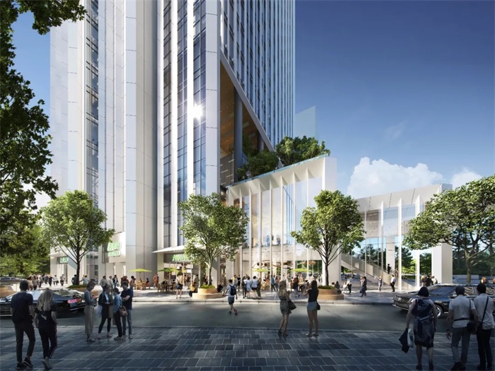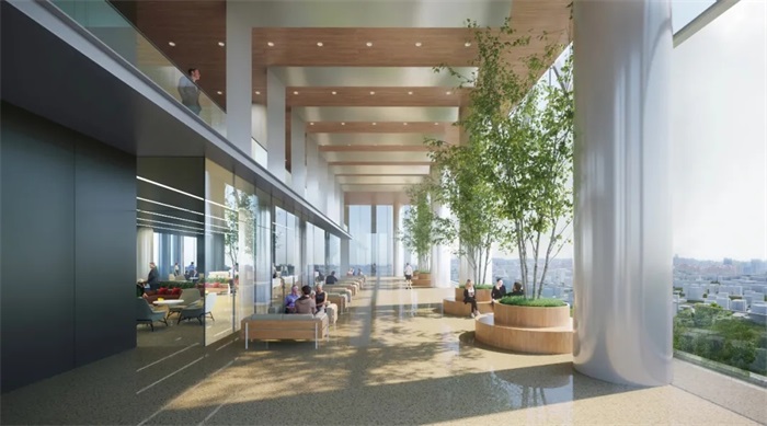 流动空间“水之意”:建筑内部设计了一个空中花园垂直体系,从屋顶到裙房,创造了一个流动空间,就像水流般绵延贯通。它不仅能为建筑提供休憩和活动的场所,还能调节建筑的微气候和节能,适应深圳亚热带海洋气候,也能满足城市拓展生态空间的要求。