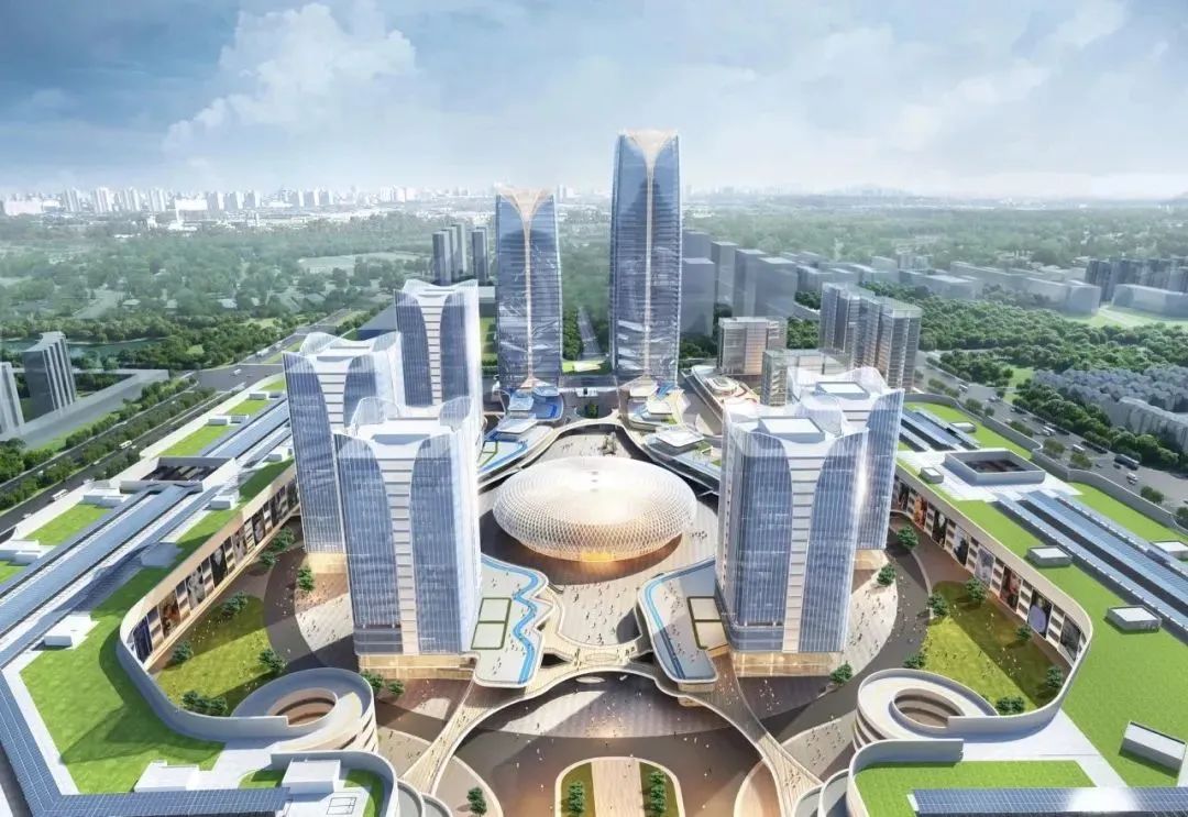 项目规划采用“一心两环”的中心式总图布局,外部以市场商贸环承接西侧国际商贸城五区、沿市政道路界面延续市场形象,内部以商办活力环加中心数字大脑打造聚核心、汇人气的24h生活贸易综合圈。外围市场商贸环布局四大市场板块,内部商办活力环由七栋写字楼及飘带式的商业裙房环抱中心数字大脑组成,七栋办公楼由70m逐步攀升至100m,位于基地东侧的两栋双子塔成为城市天际线制高点,整体形象呈现七星还珠、步步升腾的态势,打造义乌城市新地标。