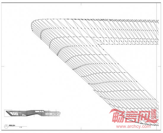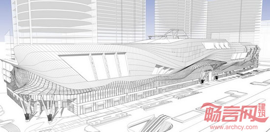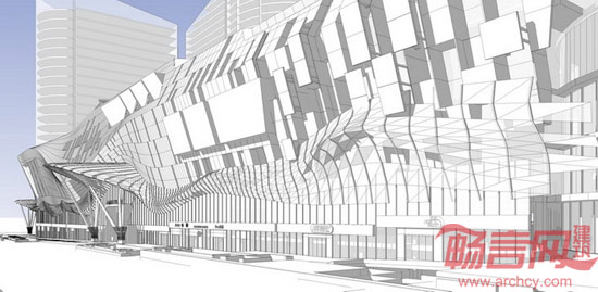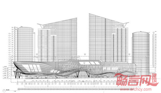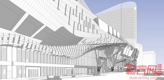 建筑立面以海洋为主题,在城市尺度方面以大尺度流线抽象的航行船体为光面金属幕墙系统,船首在西南角突出和国际会展中心遥相呼应;白天在自然光的照射下耀眼突出,晚上暖色泛光人工照明渲染出另一种绚烂效果;船身局部条状突出及凹槽内藏灯光,白天产生立体阴影、晚间灯光效果增加立面多样及丰富性;