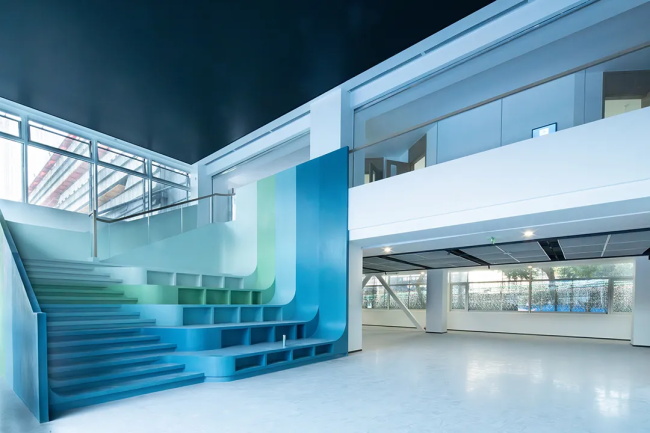 结构松一口气之后,空间开始流动。改造原有狭窄通道和楼梯,并将两栋楼联通,形成“二层科技、三层音乐、四层美术”的垂直学科带;原来1.1米的走廊被拓宽至2.1米,在合适位置放大处理。