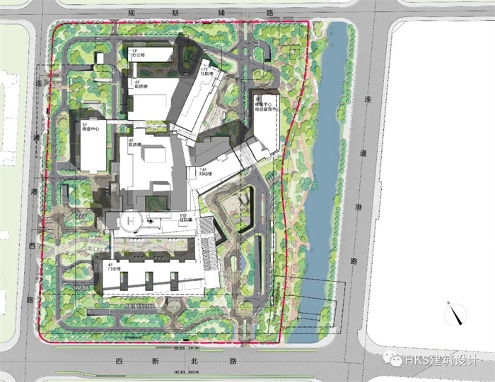 本项目分区明确,妇幼中心、康复中心、肿瘤中心等不同中心内部流线紧密,门诊、治疗区与住院区上下层设置,缩短病人就医流线,减少不同病重之间的交叉感染。每一个诊区都设置三级候诊体系,引入自然采光和通风,建立健康舒适医疗环境,细致推敲VIP病房、康复治疗的特殊要求,满足无障碍等人性化要求。门诊和住院患者之间、不同中心的病人之间、VIP和普通患者之间流线相对隔离,尊重病人隐私。病房设置以单人间、双人间为主,减少病人之间的相互打扰。每间病房均有良好的景观视野。每个护理单元超过2000平米,设置了充足的休息、活动空间,分别设置病人、探视、医护、洁污、污物电梯,流线明确,交通高效。本案按照国家发布的节能标准进行设计。利用屋顶和下沉空间做绿化花园,美化环境,有利于患者的修养及康复,建立包括护理单元内部活动空间、空中屋顶花园、下沉广场、沿河景观带的立体康复体系。