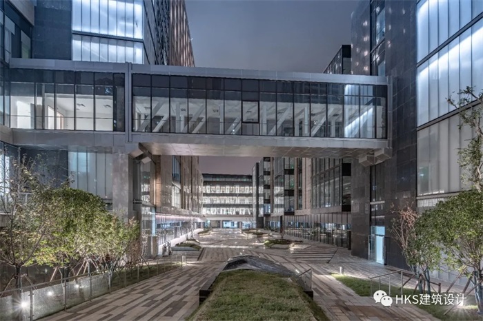 不同体量之间,塔楼与裙房之间以及建筑塔楼之间,均用“桥”连接在一起,并且通过形状和材料的动势平衡来形成一个三度空间的立体几何派空间造型。桥梁的结构构件与悬挑等力学元素应用在建筑造型中展示出桥梁建构的艺术之美,科技之美,同时暗喻着历史与当代,现在与未来的沟通与交流。