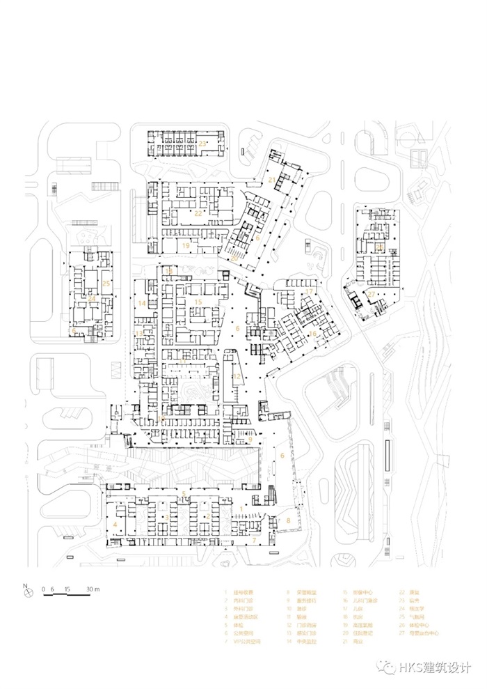 本案在平面布局上采用集中和分散相结合的方式,以医技为核心,一条中央医疗街既连接日间各个功能空间,又便于夜间独立运营管理。住院楼位于医技楼上部,通过内部竖向交通核及内部通道,和医技各个部门紧密连接。门诊区位于地块南侧,以连廊和医技相连接,又以下沉广场和医技相分割,巨大的室外步行空间是给门诊医技人流提供了天然的休息场所,同时给底层商业提供商机,更加增强了周边社区和医院互动的可能。