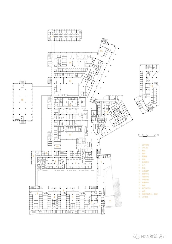 为了尽可能地形成朝南的景观视角,获取更多获取直接日照的病房,以及便于明确分期,整体平面布局呈风车形,由内核向外扩散。门诊面向内广场,便于广大公众识别,疏散与就医;从主要交通流线看去,急诊科及其抵达广场易于识别,便于到达。妇幼中心(一期住院楼)临河而建,这样的布局有利于月子中心面向景观优雅的疗愈区。VIP住院塔楼(一期住院楼)可俯瞰门诊大楼及其内庭院,二期的住院塔楼也因独特的平面布局可获得良好的河景视角。