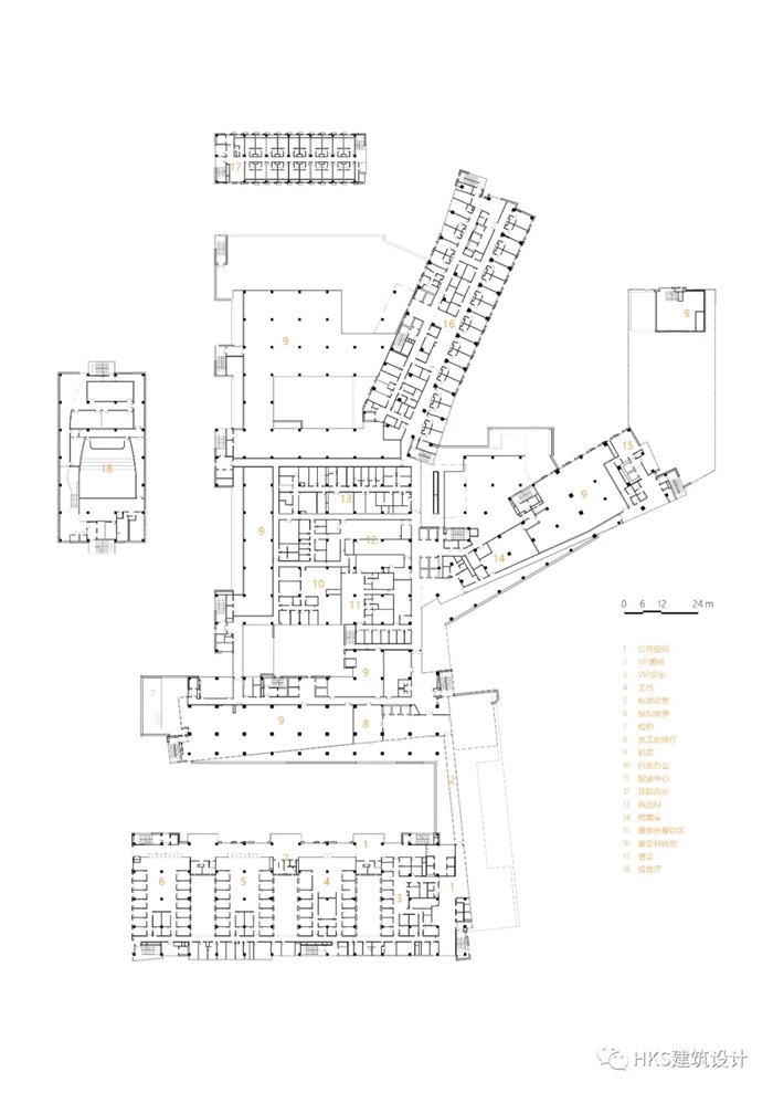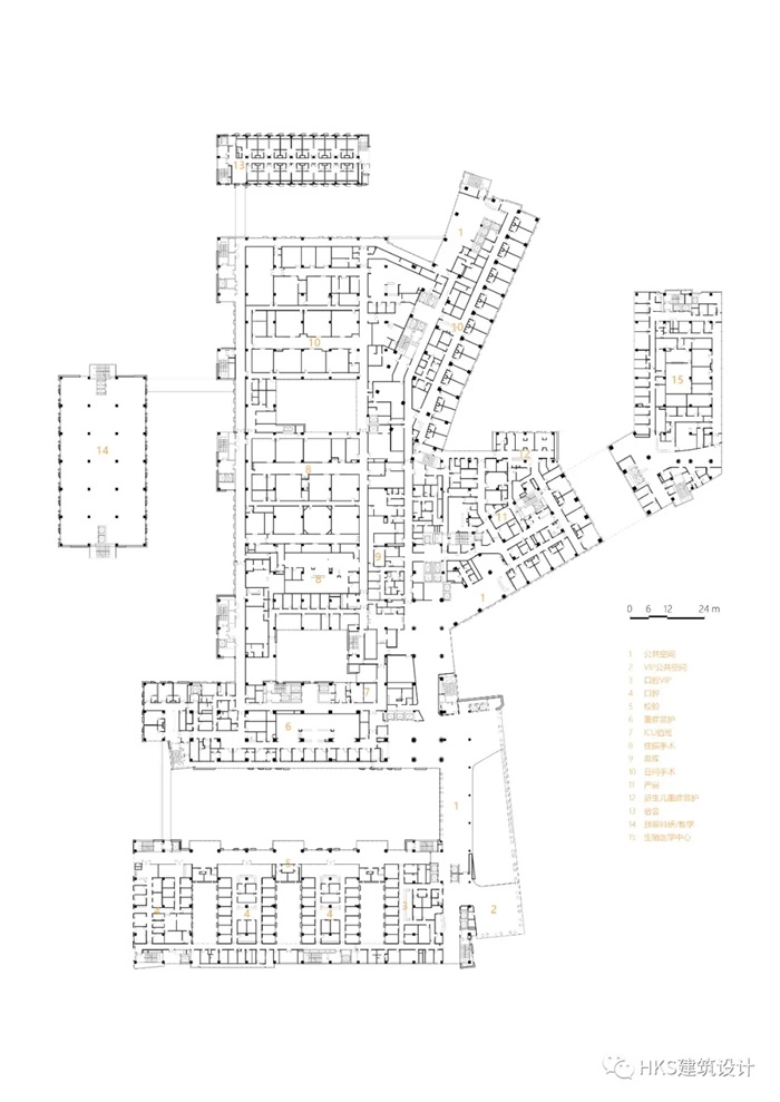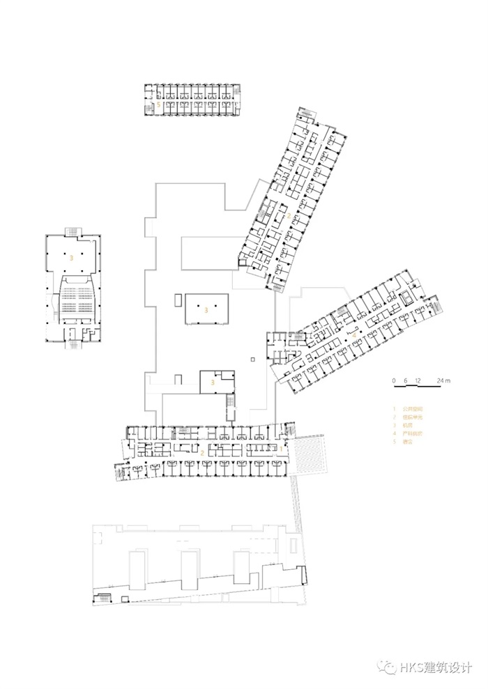 三层平面设置门诊、ICU、住院手术部和日间手术部、血库、产房、生殖中心。