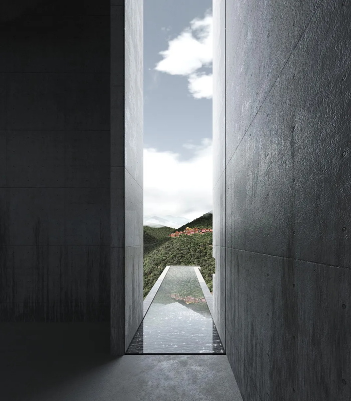 博物馆的方位经过反复推敲,构建出一条门厅与寺庙的空间轴线。游客沿着登山小径缓步走进博物馆,幽暗的门厅正中切开一束明亮的窗口,窗洞精准和寺庙大殿的金顶相呼应,在浅浅的景观水面中闪烁着光芒成为空间的焦点。寺庙四季的晨、昏、雨、雪定格成博物馆的第一件展品,静默中完成一场跨越八百年的时空对话。