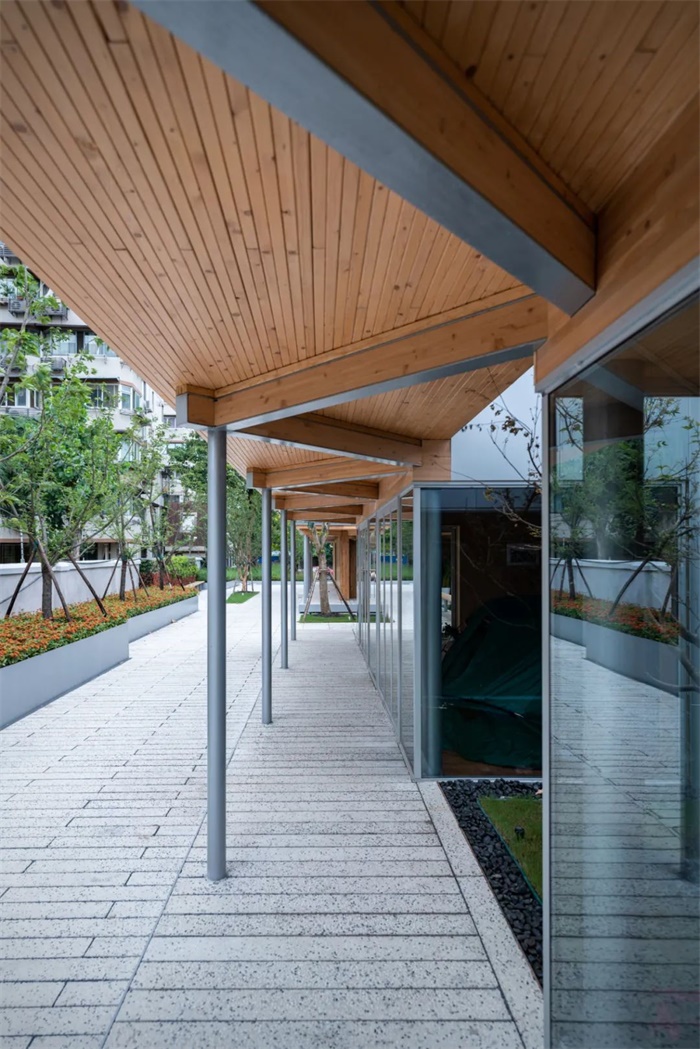 从星空剧场向北回望,以公共卫生间的绿植屋顶为前景,正好望向作为普陀区城市地标的环球港双塔。口袋公园的南北穿行路径蜿蜒曲折,宽窄变化,一侧由驿站长长的水平檐廊限定,一侧是衬有绿植墙的小区围墙及花坛,间隔设置休息座椅。通道南端稍放大为一处小广场,以坡道及变幻的台阶与略高的滨河绿道相接,并有一部略偏西南的直跑楼梯通往天台花园,楼梯上半段与绿坡屋顶夹角处稍放宽为可坐人的面河台阶。