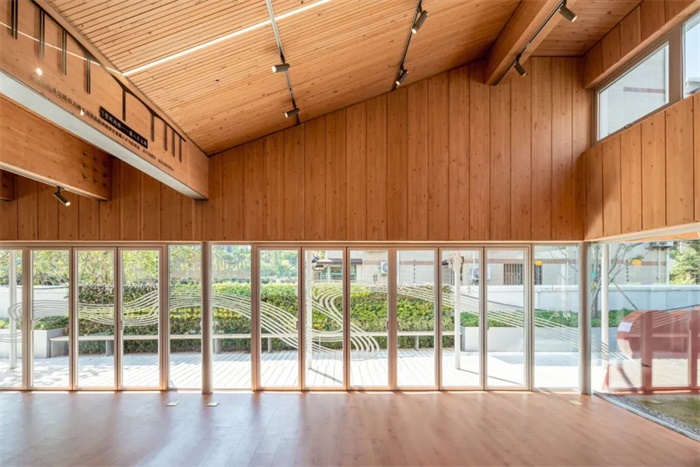 室内顶棚以露明的单向密肋梁为特征,并与灯光结合。休息室北侧随着屋顶的升起引入了柔和的北向高侧天光。休息室和展厅的实体外墙覆以氧化铝平板,卫生间的外墙为深层碳化防腐木墙板。檐廊的屋顶为直立锁边的铝镁锰板屋面。