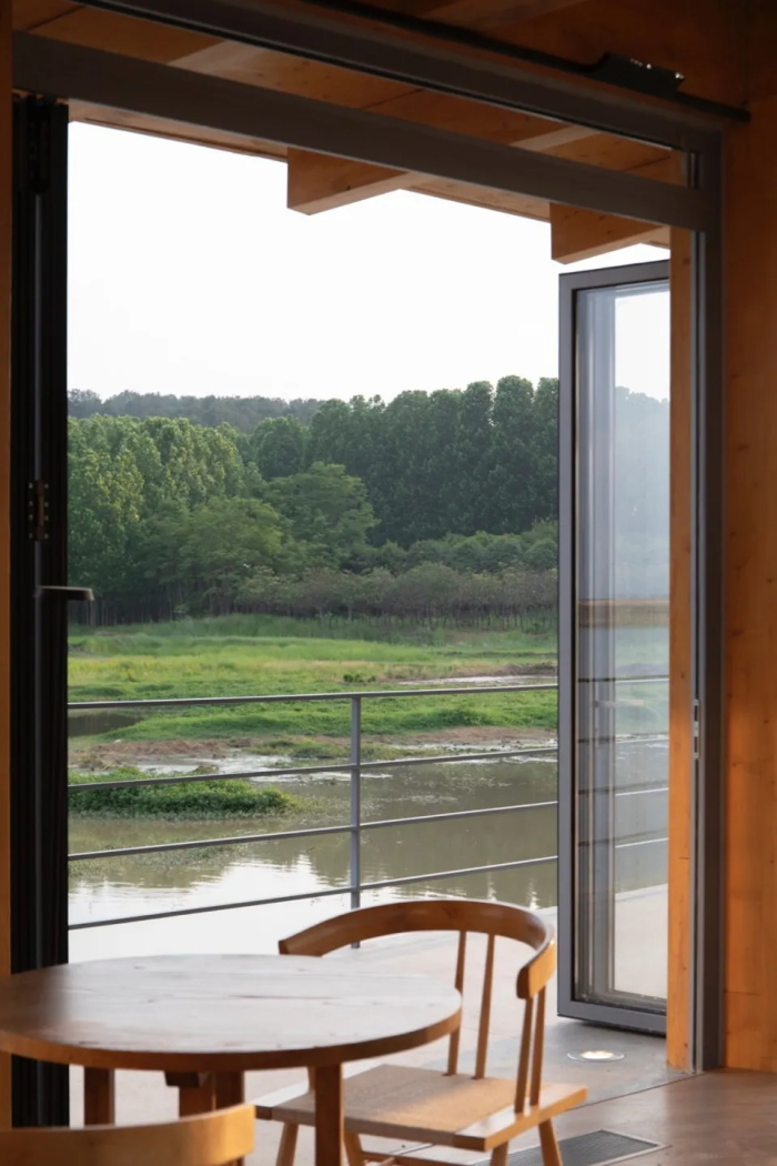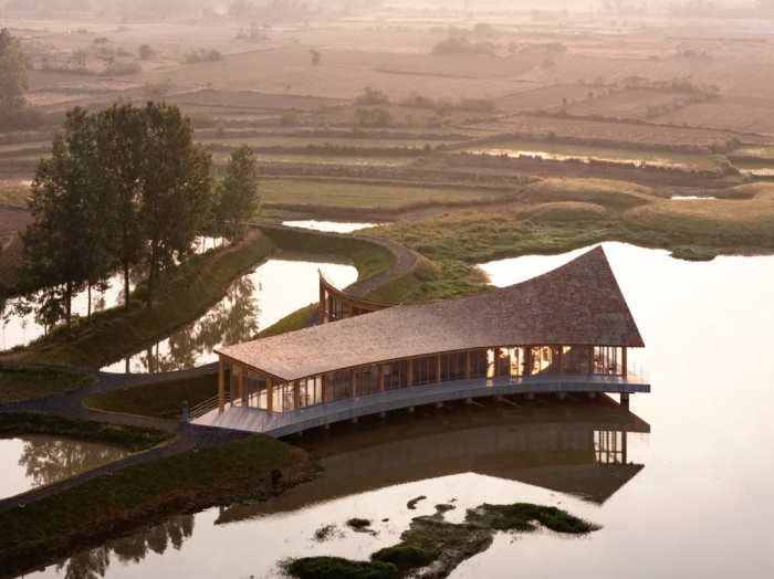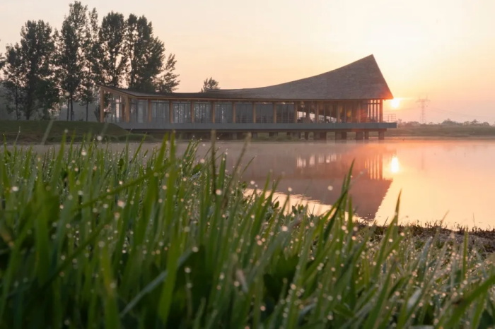 浮舟纪村民中心选址于信阳刘岗村水库岸边,形成"三面环景"的空间格局:东侧紧邻成片水稻田,北侧是刘岗村民居村落,南侧面向灌溉水库,西侧与凤凰山相接。
