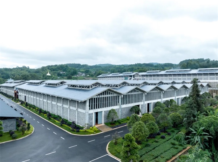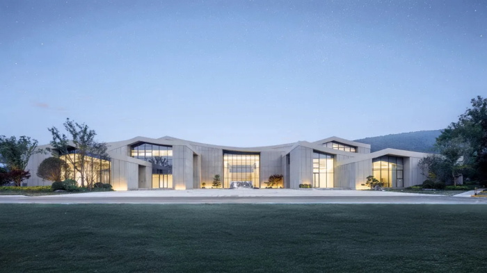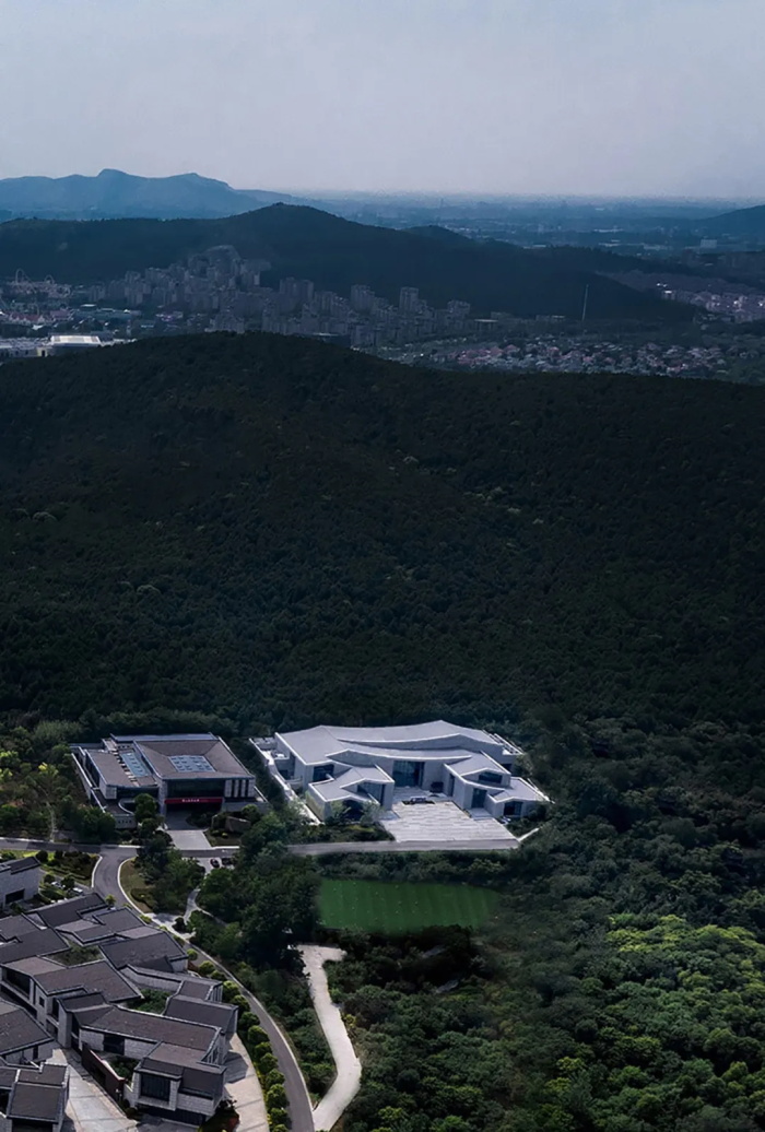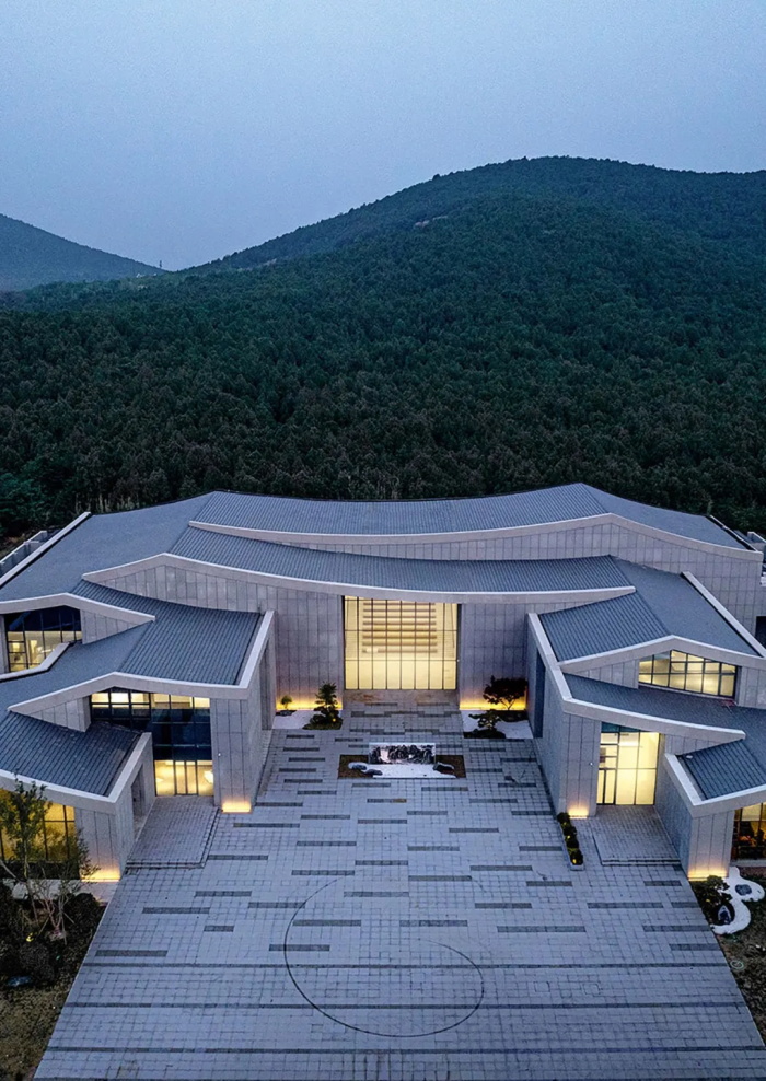 建筑通过“望水(视野渗透)–补山(形态呼应)–融山水(空间共生)” 三重策略锚固建筑与场地关系,错动线性铺装引导观山视线,以4.5-15m不同标高的连续曲面屋面模拟山势,将真山真水联动,以在地性设计回应了自然环境。