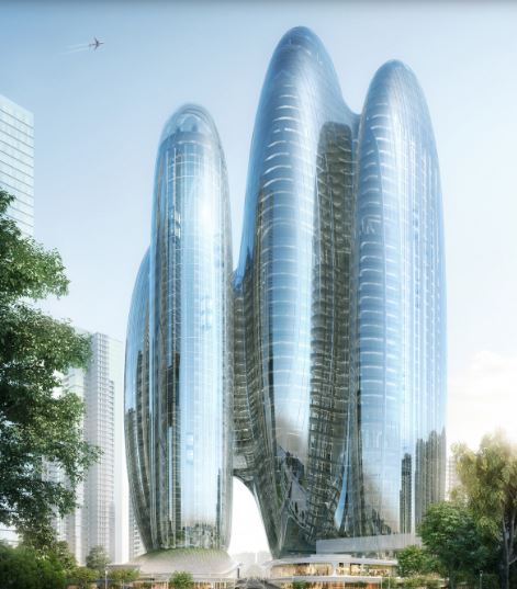 该项目由四个互通的塔楼组成,共计42层,高度可达200米。而项目的总占地面积则达到了18万5千平方米。互通的四座塔楼中,有两座塔楼呈现出灵活开放的空间状态,并由一个20层高的垂直大堂相连;而剩余的两座外部塔楼,则主要用于提供包括垂直交通在内的各项基础服务所需。此外,为了尽可能地增大其对于深圳湾的观景视野,建筑师还于较低处将塔楼向内进行了锥形倾斜的调整,以创造更大的街道城市空间。