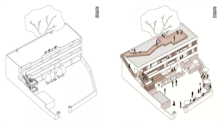 小学是村里除了庙宇、戏台以外仅有的集体产权建筑,改造后在沿用作村里的办公、活动空间之外,其使用对象也将包含进入村子的志愿者、画家、游客等城市人群,多样化的功能需求与植入如同一个“乡村综合体”,在延续村集体原使用功能的基础上增强其开放性与可持续运营能力。通过三层空间及屋顶平台的垂直差异性组织,形成由公共活动空间到办公、住宿、观景的纵向分层。