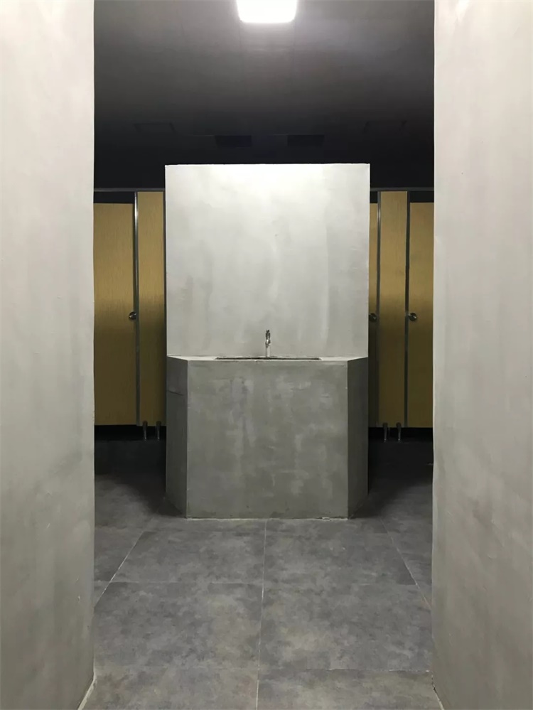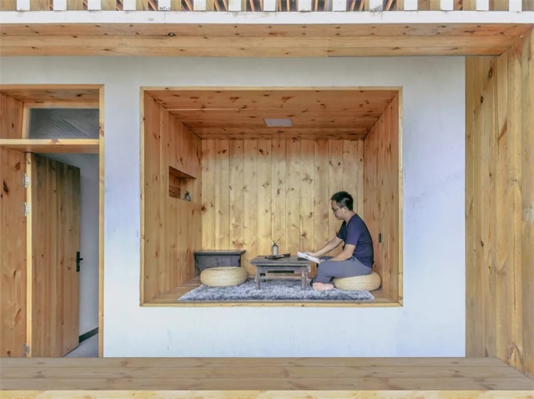 原小学外廊狭长单调,改造利用窗墙厚度与柱间宽度,置入长凳、倚台或茶室凹间、洗手池等家具空间,并压低走廊高度与外廊视野,让其更贴近人体尺度。通过浅空间的再造,为外来客人提供更丰富的交流和休闲空间。