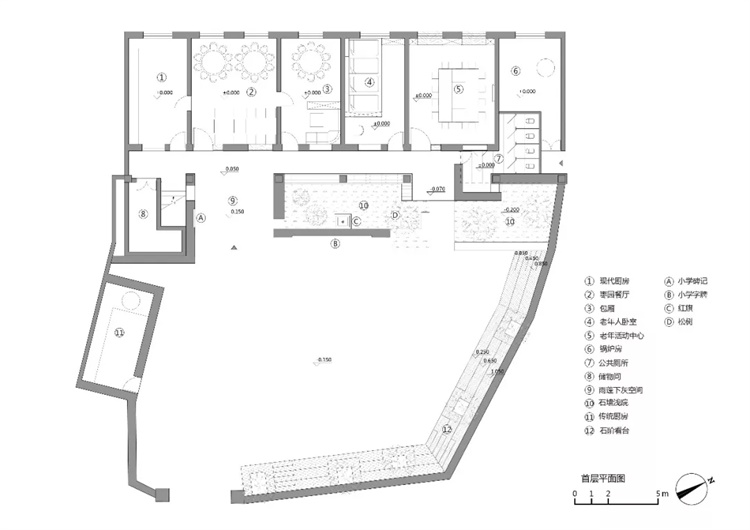 一层楼前院子是村里主要的集体活动空间,由一堵刷成粉红的砖墙围合,每次开会或举办集体活动,村民们都需要搬来很多凳子,或者站立着围聚在一起。针对这一现象需求,改造倚着原来的院落围墙,向内扩展成石阶坐台,尽端设置伸入建筑内部的公共卫生间,并在石阶退台中预留出错落的树池,希望在方便村民活动的同时,增加坐望的休闲体验。