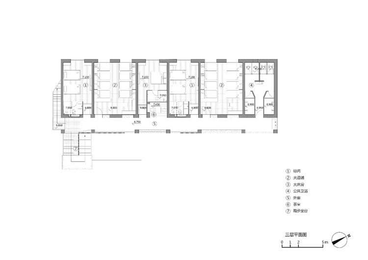 功能所对应的空间改造策略以小学特有的外廊式框架承重墙结构为基础,利用原教室与办公两种面宽尺度(5.1米、3.5米)的差别,植入枣园餐厅、老年人活动中心、公共卫生间、大通铺、标准间等新功能空间。以小学公共外廊空间为枢纽,在楼层上下扩展、延伸。通过深、浅空间的再造,与日常行为、景观视野的连结与强化,触发新空间的诞生。