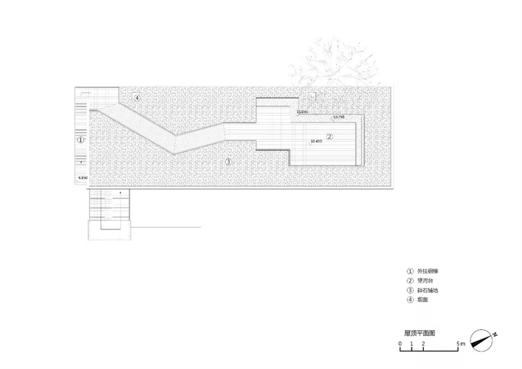 再往上通过增设的侧墙柳编钢梯,折入屋顶长廊,直至老槐树边的坐台,曲折尽致,空间豁然开朗,古枣林与黄河崖壁胜景尽入眼底。