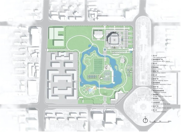 本次设计的策略性更新,在保留城运记忆、展望全运未来的目标下,意图尝试通过“针灸”的方式,以点带面,结合现今全生命周期对于生活及运动的诉求,保留生态基底、焕活自然活力,达到对于整体公园区域的二次复苏,从城运到全运,重启北城运动未来。