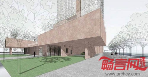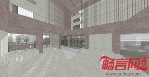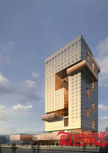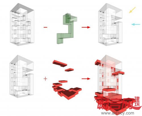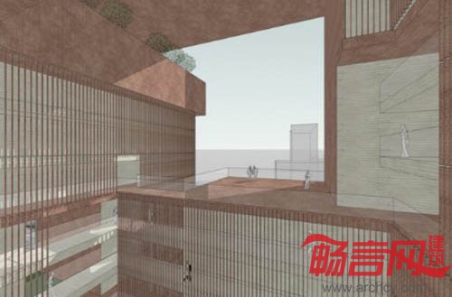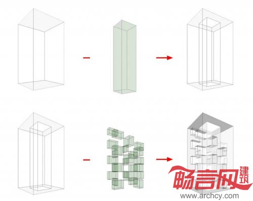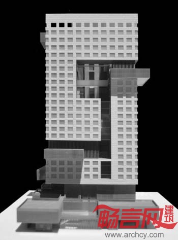 我们在这个项目中试图寻找传统的酒店功能和一些带有社会性的公共/商业功能之间更为积极的关系,并以此为基础,使这两种功能彼此受益。由锈钢穿孔板/格栅所代表的公共商业功能从地面层开始,与周边城市发生交错渗透的复杂关系,并从浅灰色混凝土挂板代表的酒店客房功能的长方形体量中逐渐盘旋上升,结束于建筑顶层的观景餐厅。此间,公共功能和酒店客房功能在平面流线上被有效的隔离并仅保留授权联络,保证客房部分使用的私密性和安全性。建筑中央的共享空间阶段性地和室外环境保持联络,将自然光和通风引入建筑空间内部。