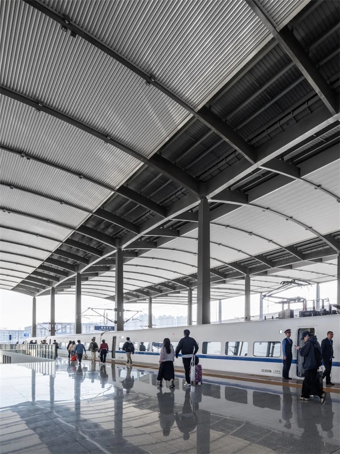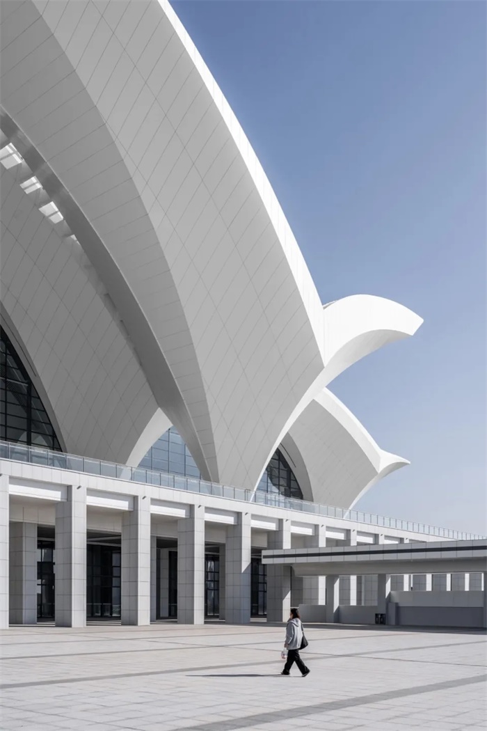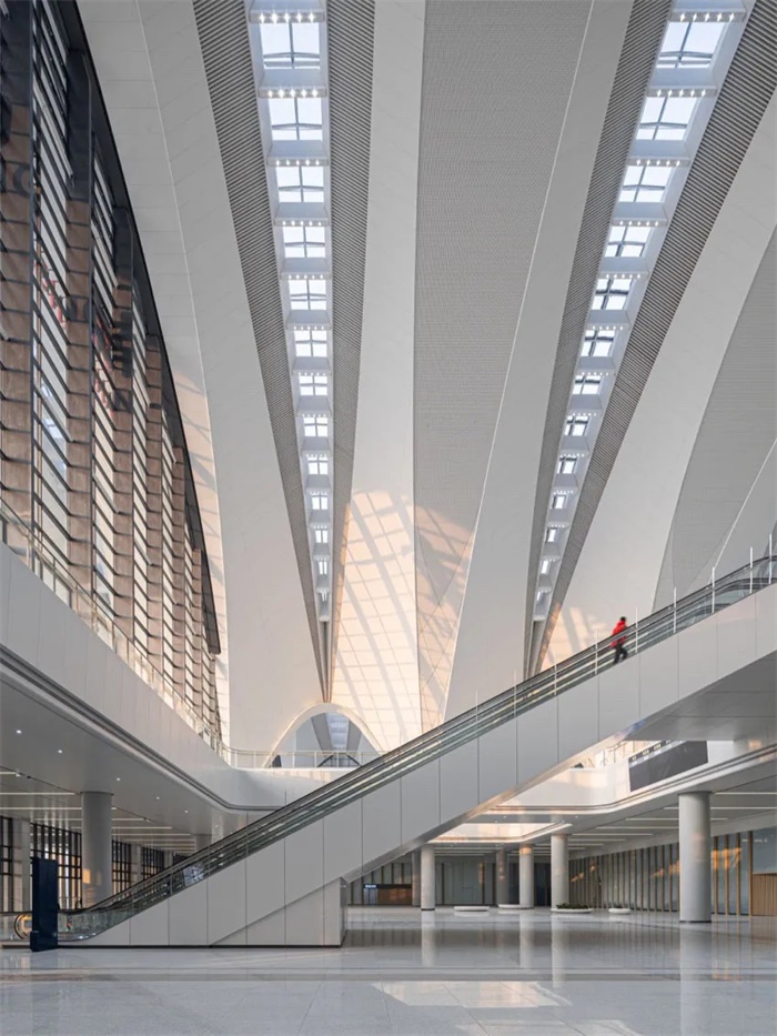 站房造型由一系列动感十足的三联拱组合而成,塑造了车站西侧极具辨识度的主入口形象。屋顶支撑结构由sbp施莱希工程设计咨询有限公司和gmp共同设计,总共由14榀三联拱钢结构组成。中央大拱跨度96米,为下面的候车大厅创造了一个宽敞的无柱空间。为了缩短结构施工时间,屋顶钢结构采用了单拱预制、工地拼装并通过轨道滑移到位固定的施工方法。
