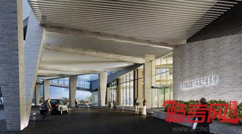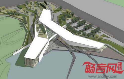接待中心是新能源基地中的标志建筑。位于园区主入口附近并毗邻湖面。建筑由两条劈开的体量组成,两部分都向湖面打开。交叉处用一个封闭连廊连接。建筑一层是展览空间和餐厅,二层是办公和会议。两部分交叉处形成一个带有顶棚的广场,可举行多种活动。建筑体量起伏逐渐从环境中生出,与矮墙和植载等景观一道形成完整的一体。建筑的长向主要朝向南北以减少能耗。