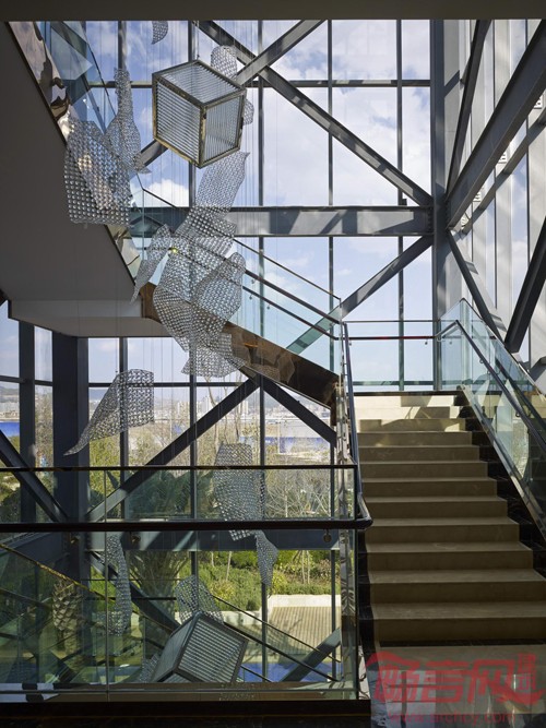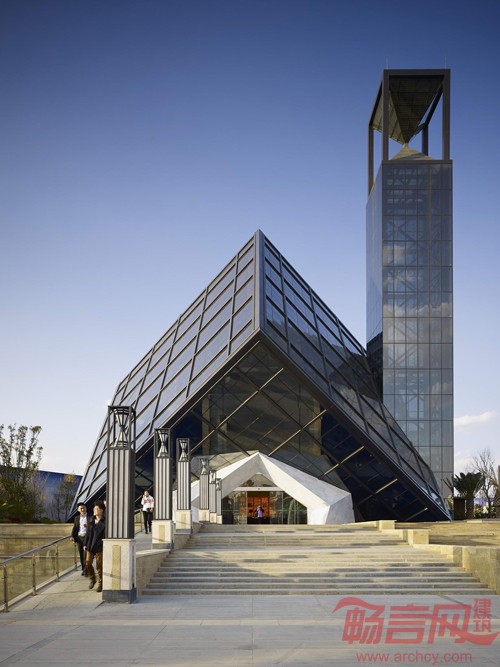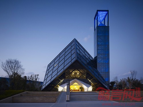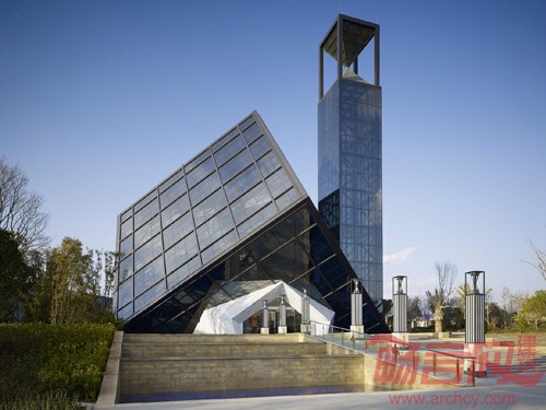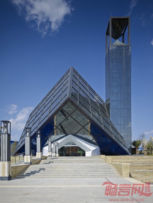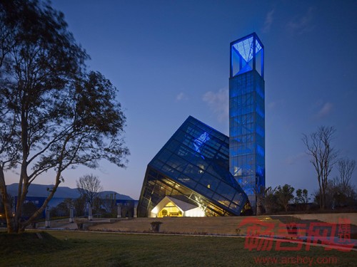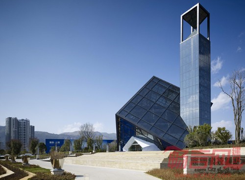 此方案采用“云立方”的设计理念,通过对立方体的两次旋转,得到既理性,又富有冲击力的建筑造型。为实现其丰富的空间变化和平面功能,将采用钢结构为主的结构体系。倾斜立方体的外框架,也将采用空间钢结构体系,根据建筑立面穿孔金属板分格,合理布置结构骨架,在不影响室内采光,通风的同时,实现其外立面整体感强,富有科技感的特点。东侧的钟楼设计别致,楼顶部分为形似沙漏的计时器,LED光模拟沙漏的动感,在两个椎体之间流动。