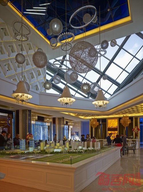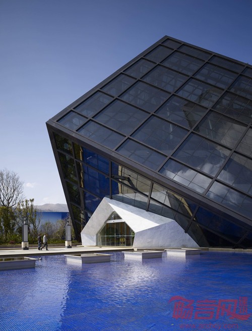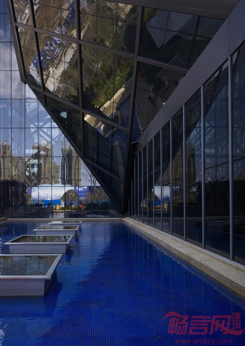 售楼处坐落在一片云形浅水池中,东侧连接一片云形小广场,供室外集会,布展使用;西侧设置临时样板房展示区,南侧设置地面停车位。其余为大面积景观绿化。整体上看,建筑与周围美景相得益彰,凸显“云立方”设计理念,给人留下深刻印象。