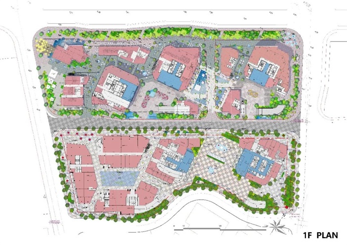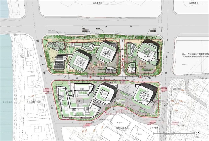 项目分两期开发,一期为北侧靠近大关路地块,包含2栋75m和1栋95m高塔楼,以及多栋1~3层商业设施。二期为南侧地块,包含1栋100m和1栋120m高塔楼,以及多栋1~3层商业设施。