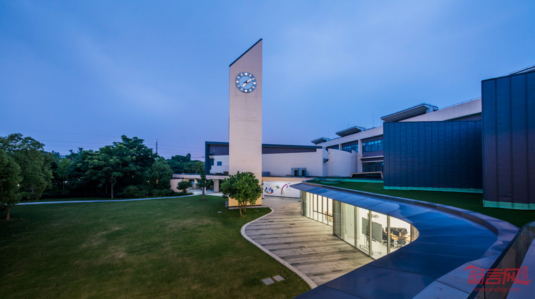 作为一个拓建项目,在设计过程中设计师充分考虑并尊重未来新建建筑与现有建筑以及景观的结合。通透的玻璃幕墙使四季的草木枯荣,户外景观都能随着自然采光一起投射进入室内,与室内延展出去的铺地融为一体。建筑外型上设计师使用了高规格品质的拉丝不锈钢雨棚,并且配合其细部的设计在视觉上达到了最大化的纤细度以及体现出整个设计弧形的动感灵动性。