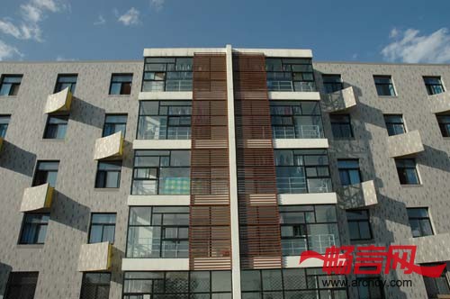 灰砖的色差设计与造型,分别由于居住者的不同:西三幢(男生宿舍),东二幢(女生宿舍)及(9层)高标宿舍而有所差别。西三幢以深灰色砖为主,跳浅色砖,东二幢以浅灰色砖为主,跳深灰色砖,高标宿舍则采用珠穆朗玛预制外挂板,深浅灰色组合。为了使建筑群体外观不至于过于理性化,逻辑化,西三幢阳台采用黄色跳块,烘托明快活泼的气氛,体现学生特有的朝气。东二幢花池采用外墙皮被掀起,体现柔美的特点。而高标宿舍则在外墙面饰黄色色块与之呼应。