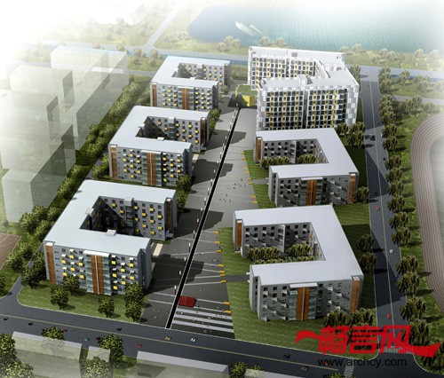沿中轴展开:高度控制为东面低(5层)西面高(6层)最东北角的一幢最高(9层)为整个建筑群的控制点。