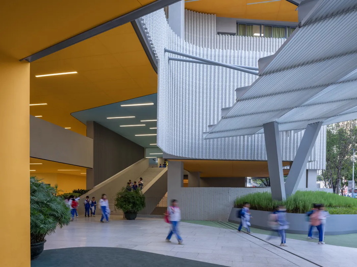 这些普通教学功能之外的多孔与架空,形成了建筑中一些动态而不确定性的元素,是校园空间中真正的价值所在。建筑师希望通过这种更加自由的空间布局可以带来全新的教育模式,模糊教学的边界,激发学生的创造力。整个校园都是流动的教学场所,课堂不只在教室之内,而将渗透到建筑的每个空间中。