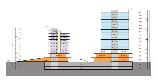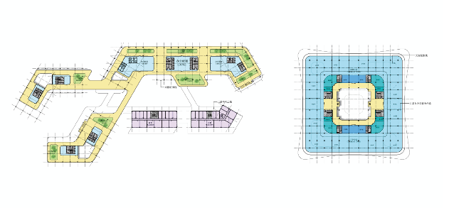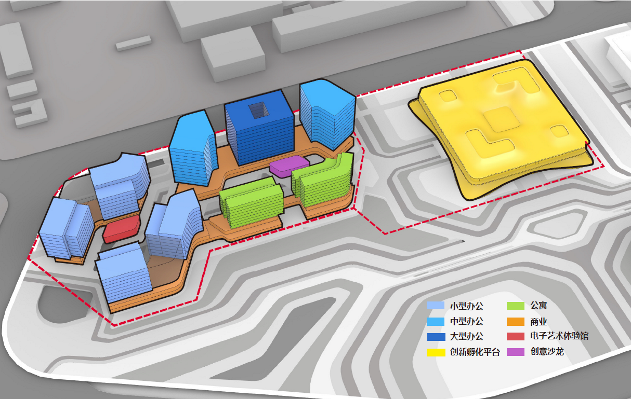 西侧地块设有未来科技广场与文创活力街区两大主题商业空间,以丰富多元的全时段商业体验,满足包含科技售展、精品商务、餐饮生活服务在内的各类需求。上方空间灵活多变的办公塔楼,在可分可合中满足各规模中小企业的办公需求。清晰的落客流线规划,分散访客以及通往办公塔楼及公寓塔楼的人流。