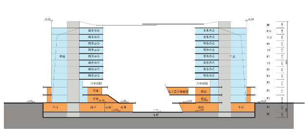 为提升基地内部的连通性,设计采用流线型布局策略,通过底层通廊,构建两个地块间的连接,让访客在地块间畅通漫游;同时通过西侧的下沉广场,与地铁站无缝衔接,激活基地与周边脉络。设计将文化中心置于东侧,与会议展览中心相邻,形成公共服务双核心。西侧地块通过底层商业裙楼无缝连接各功能塔楼,其中公寓塔楼设置在临公园一侧,通过二层的架空花园与公园无缝衔接,营造出静谧的环境与极佳的景观视野;五座办公塔楼沿街依次排布,彼此独立又通过裙楼形成连接,塑造出富有层次的城市天际线。