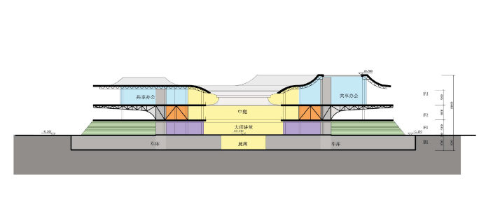 文化中心基于开放共享的设计理念,以位于中央的公共空间作为枢纽,将来自南北的人流,疏散引导至包含服务培训、商业、办公以及市民空间在内的各业态中,以便捷的可达性提升对周边的赋能服务。